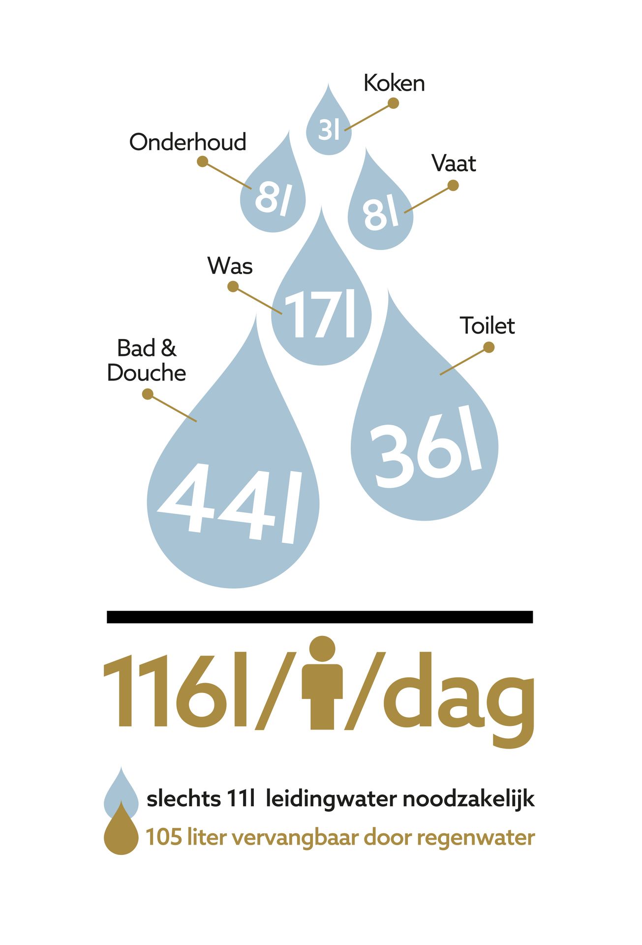 Slechts 11 liter leidingwater is noodzakelijk, en maar liefst 105 liter is vervangbaar door regenwater.